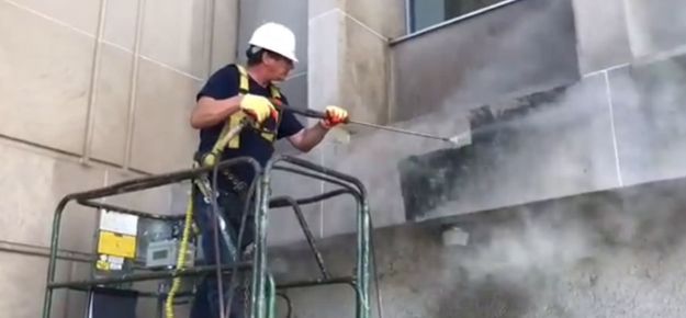 Limpeza profissional de fachadas, removendo sujidade, fungos e poluição, devolvendo a aparência original do edifício.